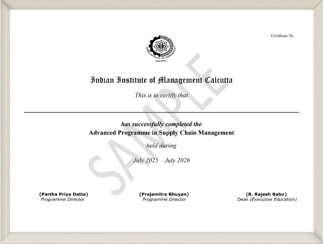 Note: - The certificate shown above is for illustrative purposes only and may not be an exact prototype of the actual certificate. - IIM Calcutta reserves the right to change the certificate and specifications without notice. - We encourage you to attend all the live sessions and make the best out of these interactive learning experiences. - Recordings are available for up to 7 days following the conducted session and 7 days before the exam.
